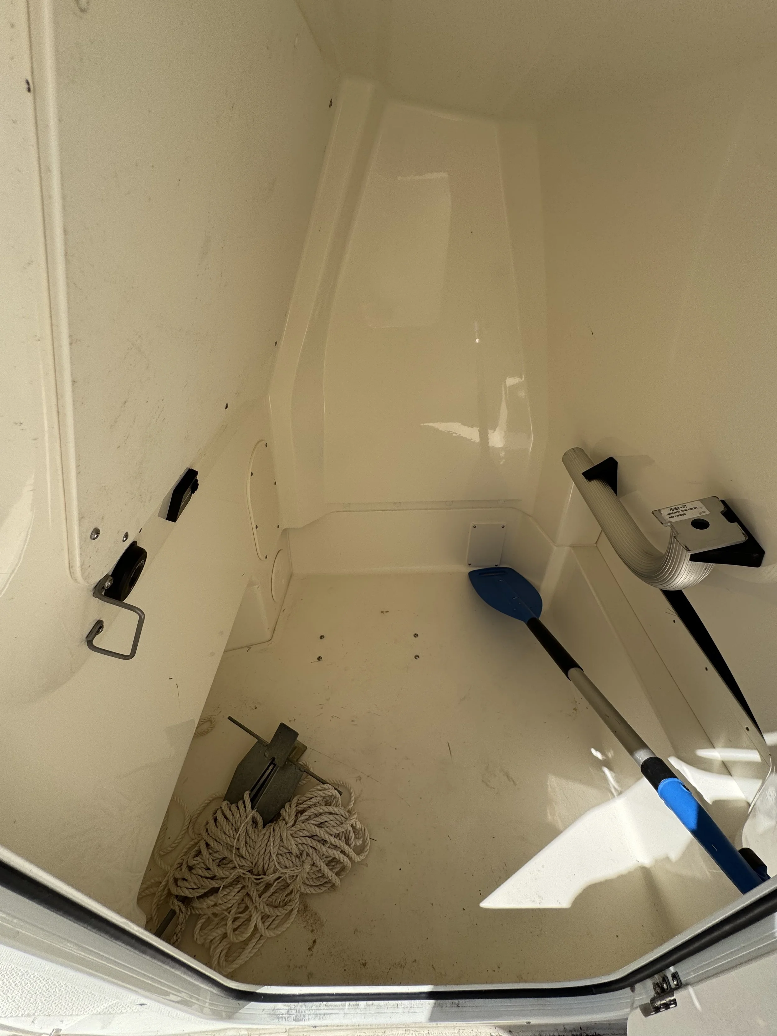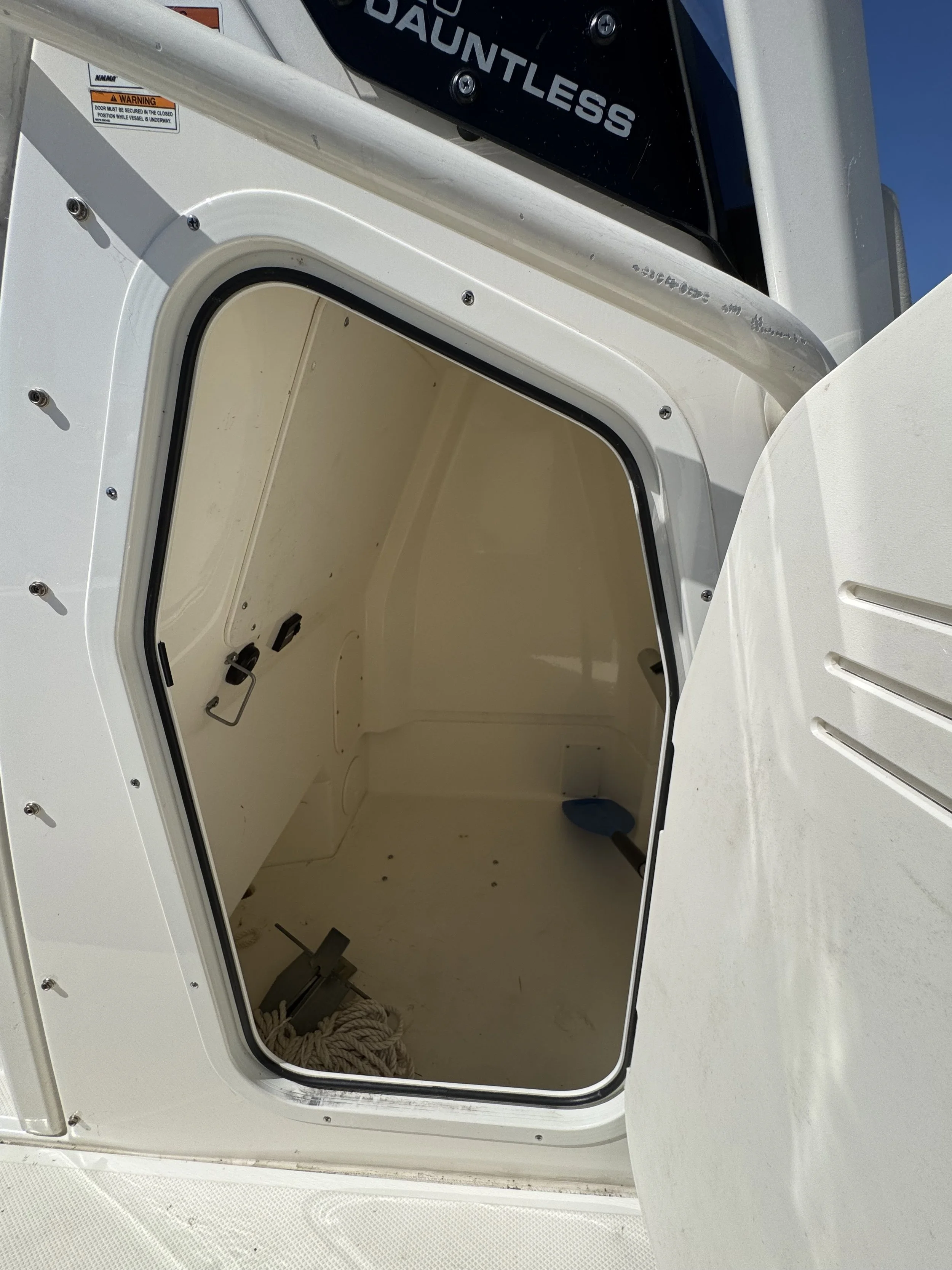 Anglers will appreciate the abundant rod storage (gunnel, bow, and stern), standard bow fishbox, and stern live well, while the folding jump seats at the stern expand deck space for casting or open up seating for passengers. A concealed telescoping ladder and walk-around cockpit add easy water access and convenience. For cruising comfort, the forward double lounge with armrests offers lockable storage and dedicated table storage, while the console interior provides plenty of additional dry storage. With its thoughtful layout, the Dauntless makes it easy to transition from a morning of fishing to an afternoon of relaxed family cruising.