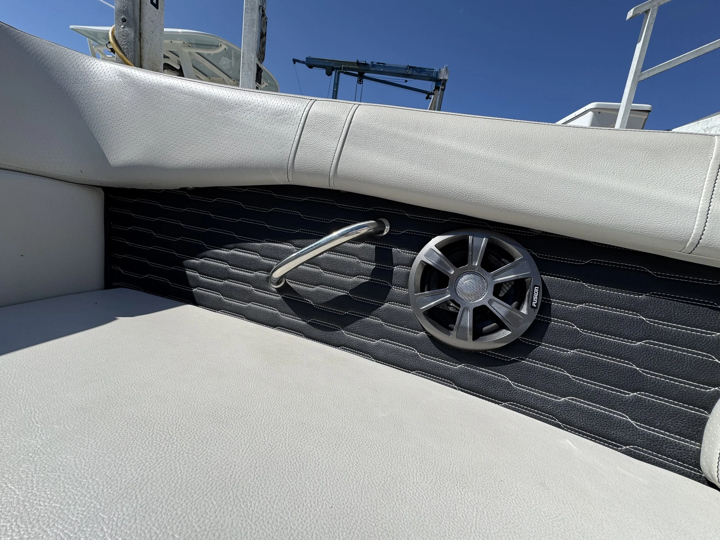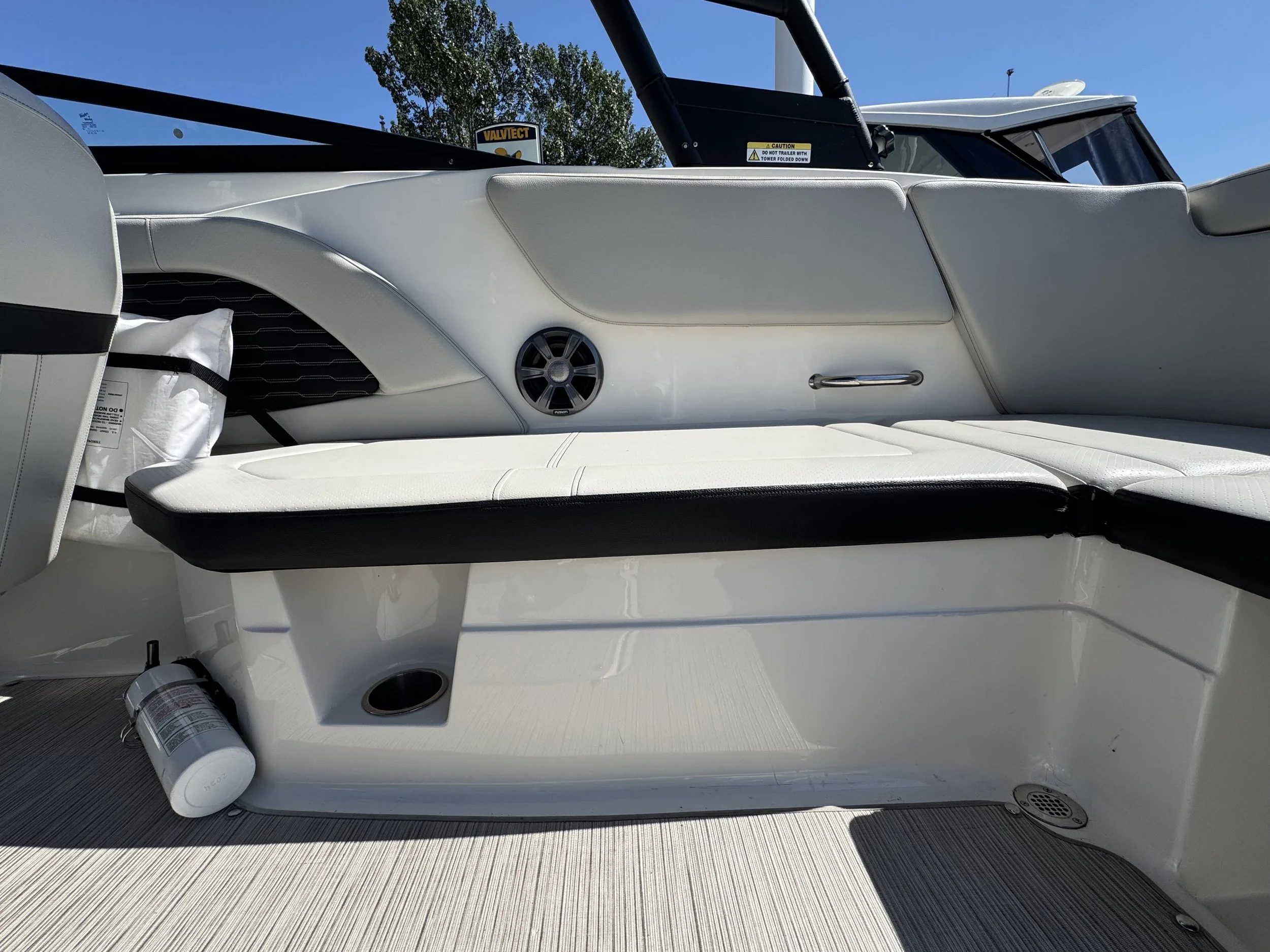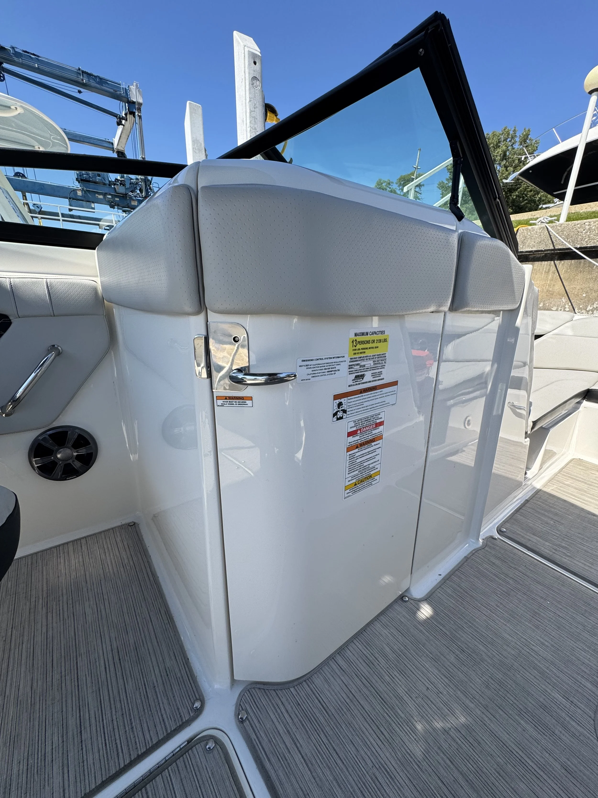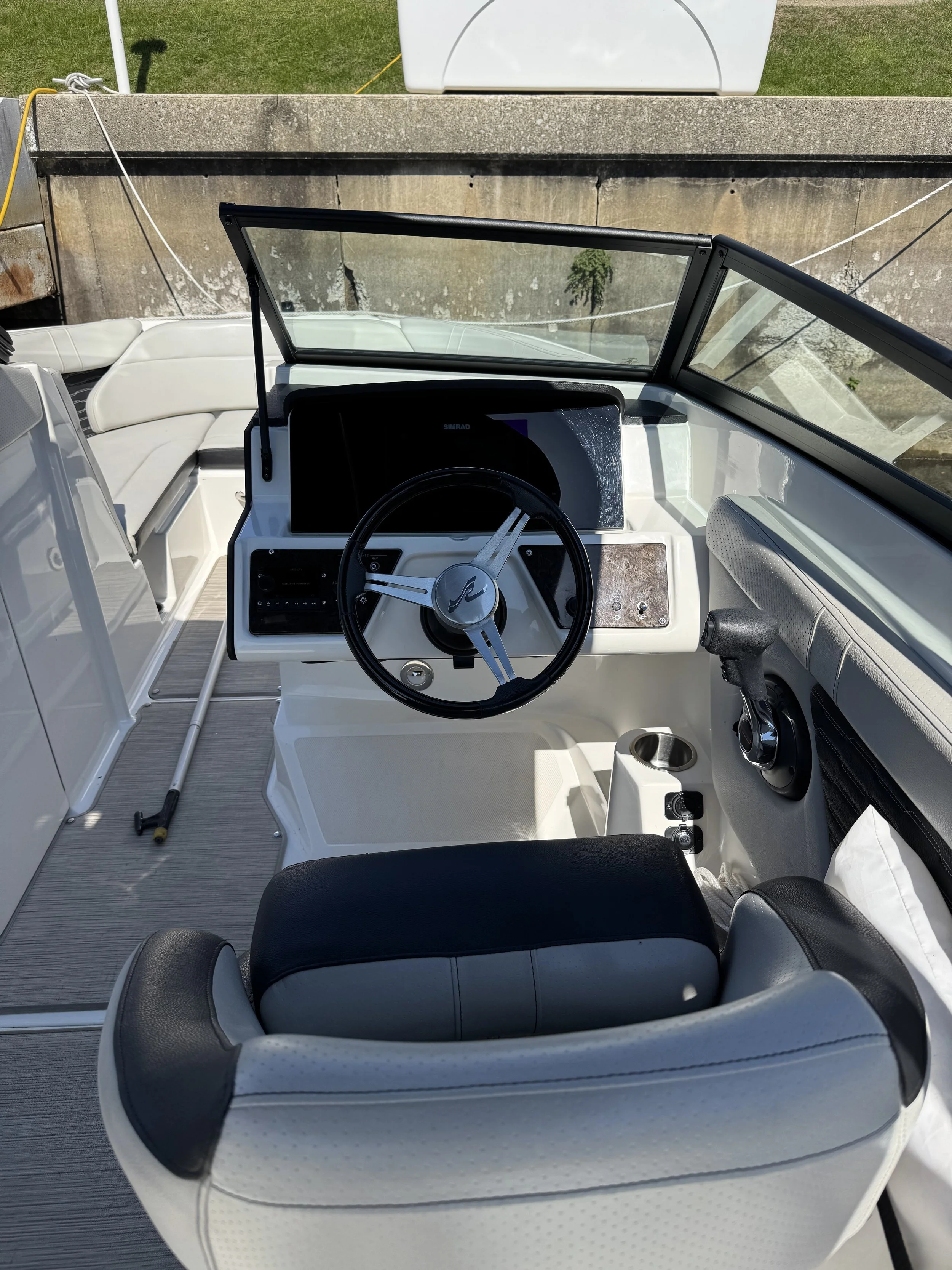 Up front, forward seating with integrated bow speakers provides a great spot to stretch out and relax. The spacious cockpit includes a smart bench seat with dedicated cooler storage and a 12V charging port. For added flexibility, the portside features an optional three-position lounger, while the convertible transom sunpad creates the perfect place to take in the view. Convenient hidden storage is thoughtfully placed throughout, including a large aft compartment for extended days on the water. At the helm, the dashboard comes equipped with Simrad navigation and a Bluetooth audio system for full control and entertainment. Premium touches like Infinity luxury vinyl flooring add durability and style. Powered by Mercury MerCruiser propulsion, the SPX 230 is equally at home pulling watersports or cruising efficiently. Its innovative hull design delivers a smooth, quiet ride, making this one of the most versatile and stylish boats in its class.