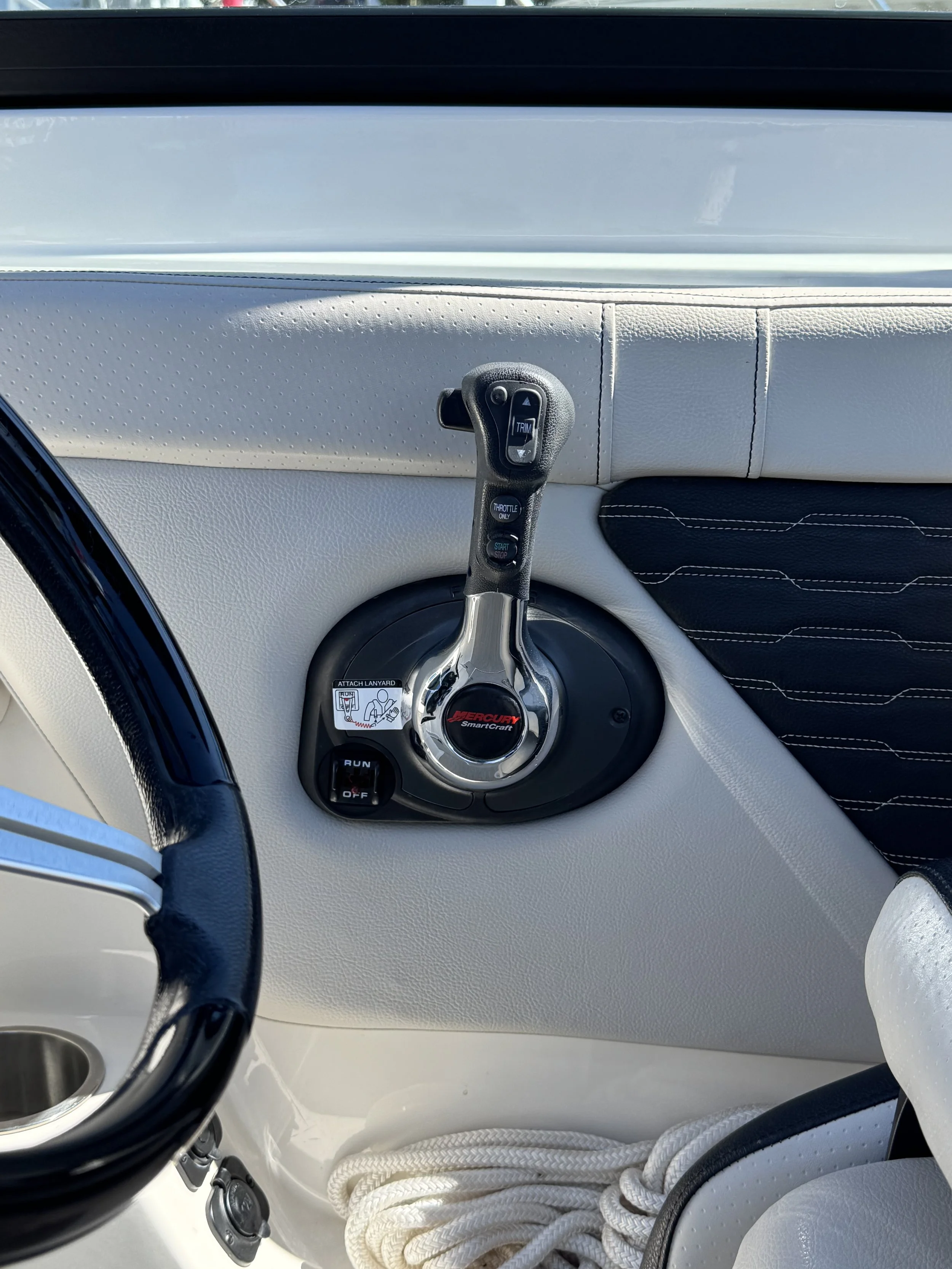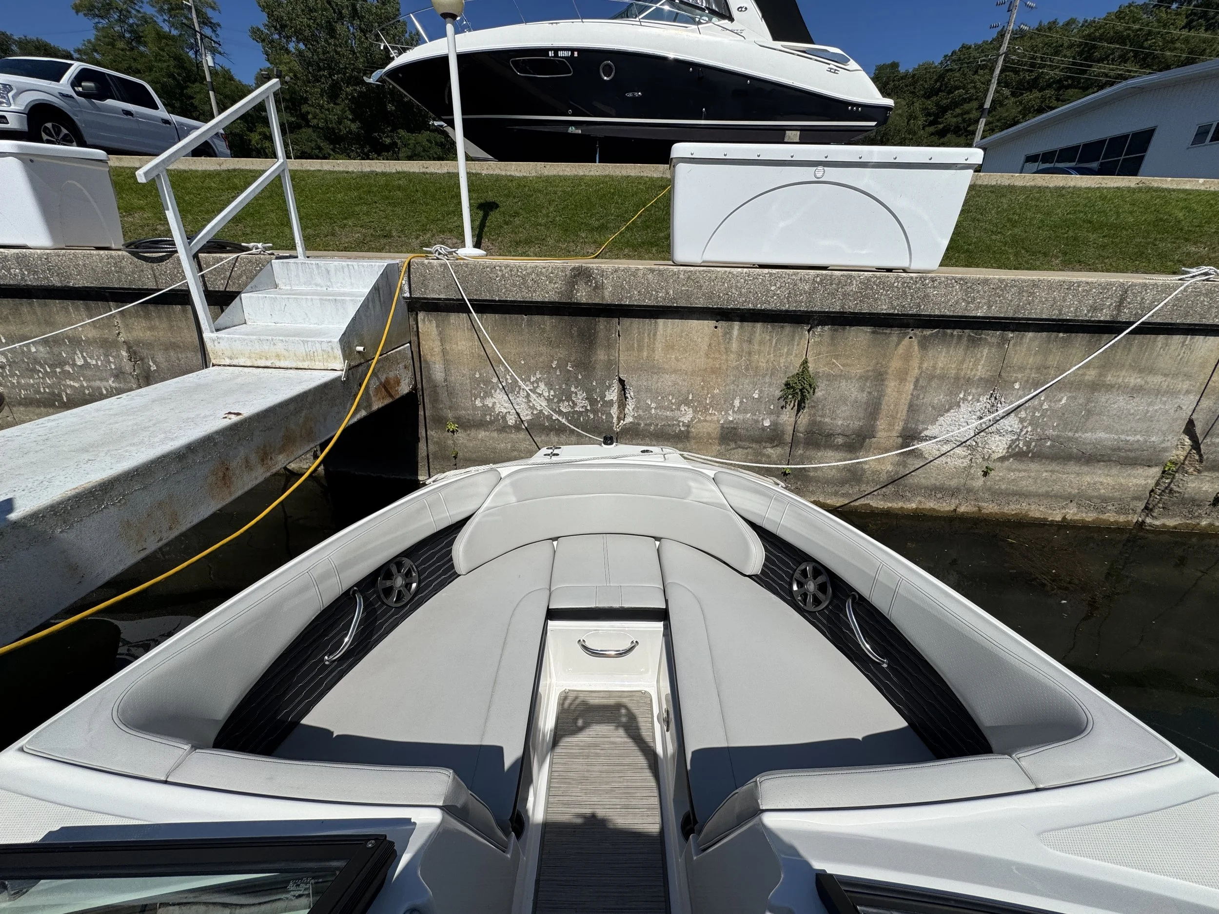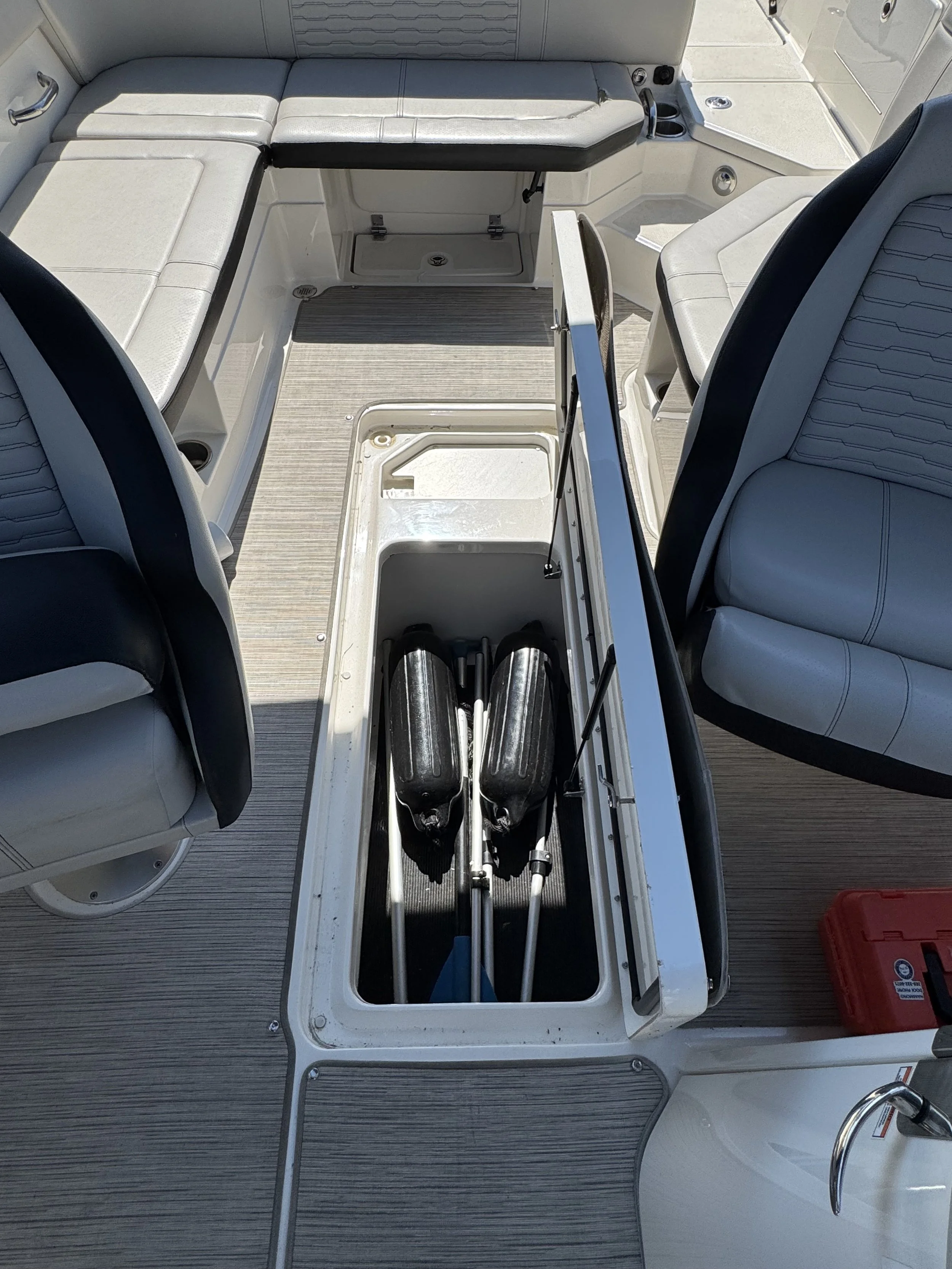 Up front, forward seating with integrated bow speakers provides a great spot to stretch out and relax. The spacious cockpit includes a smart bench seat with dedicated cooler storage and a 12V charging port. For added flexibility, the portside features an optional three-position lounger, while the convertible transom sunpad creates the perfect place to take in the view. Convenient hidden storage is thoughtfully placed throughout, including a large aft compartment for extended days on the water. At the helm, the dashboard comes equipped with Simrad navigation and a Bluetooth audio system for full control and entertainment. Premium touches like Infinity luxury vinyl flooring add durability and style. Powered by Mercury MerCruiser propulsion, the SPX 230 is equally at home pulling watersports or cruising efficiently. Its innovative hull design delivers a smooth, quiet ride, making this one of the most versatile and stylish boats in its class.