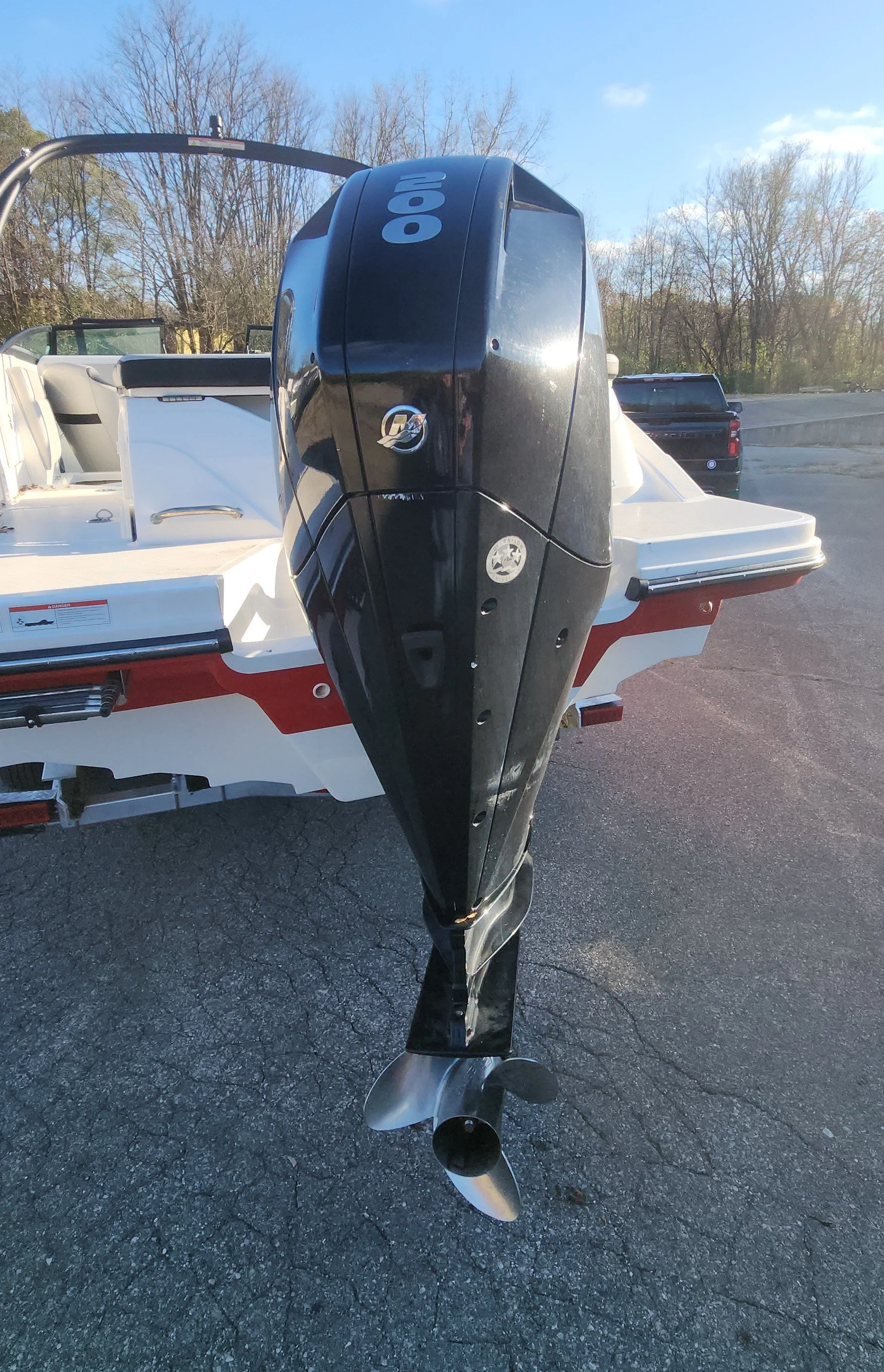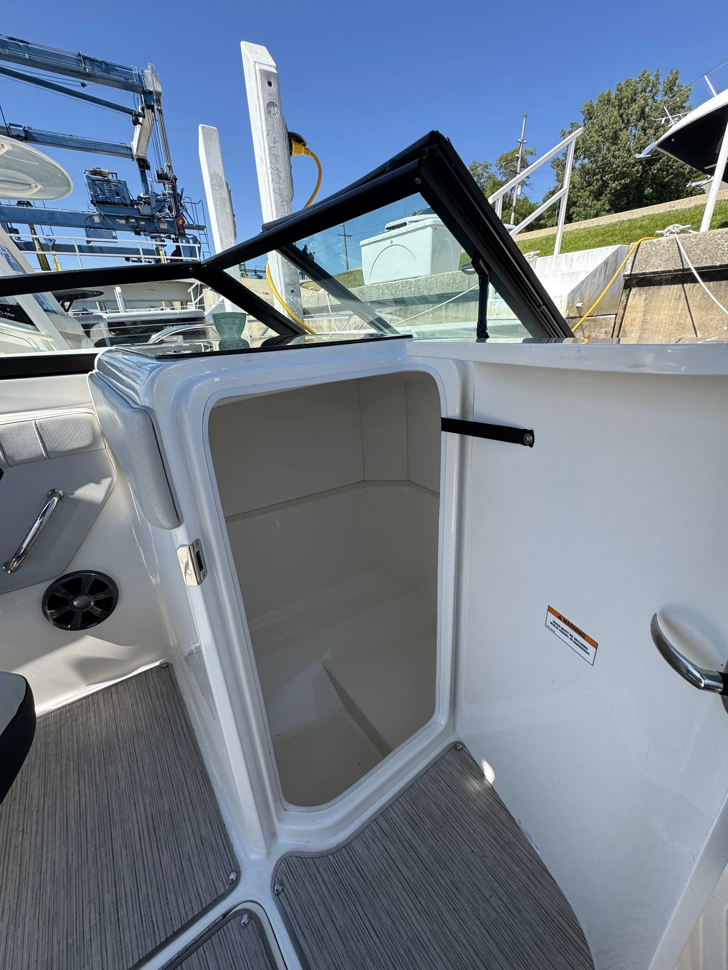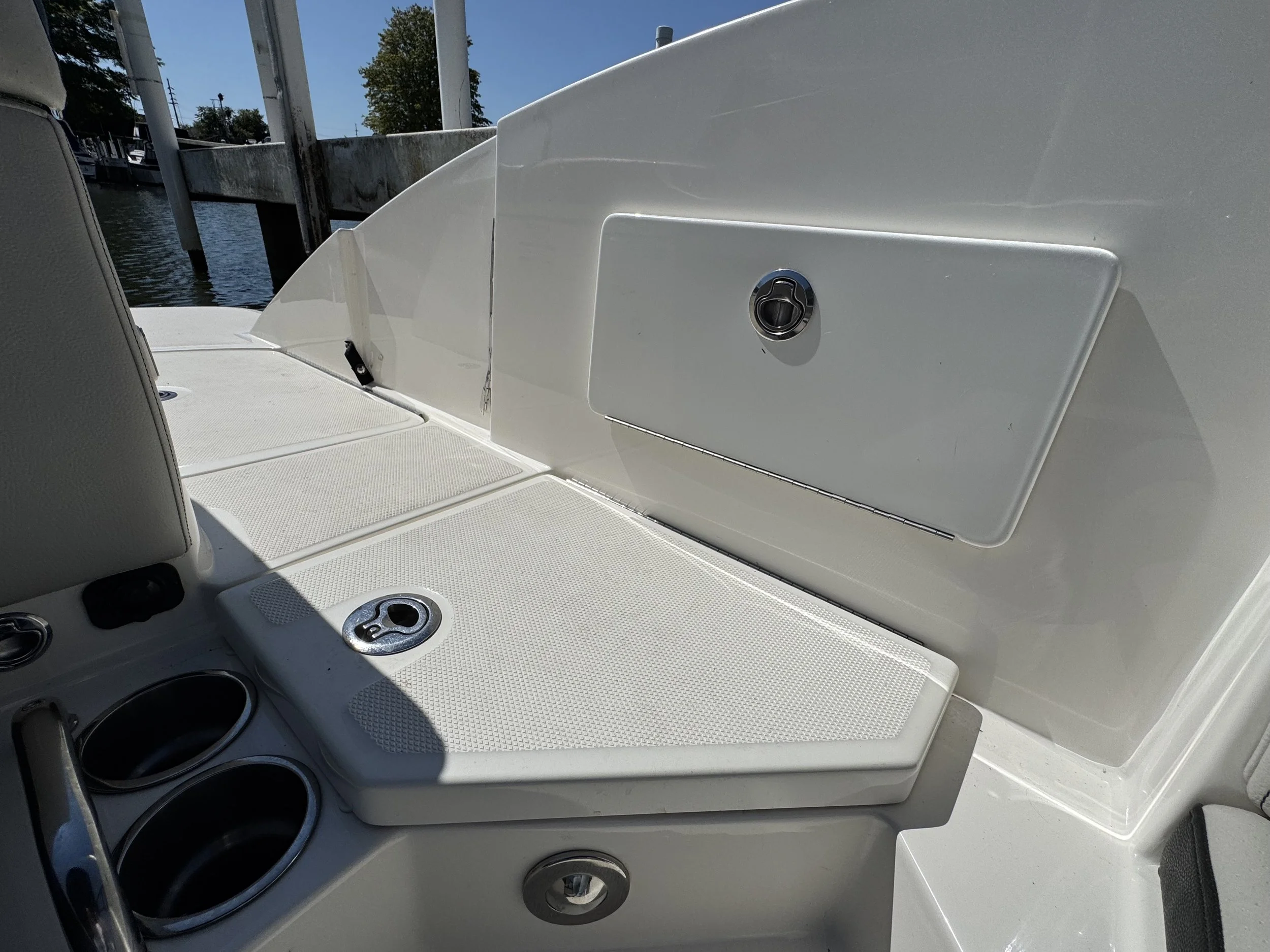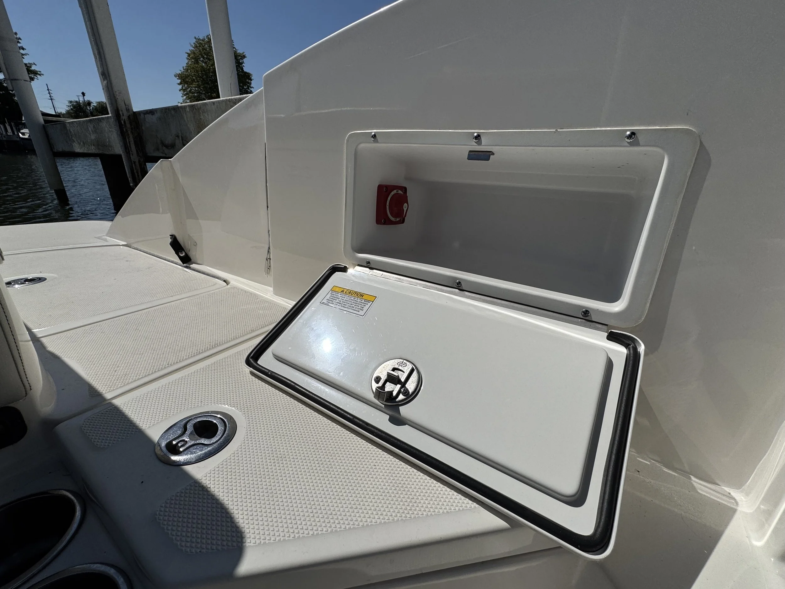 Up front, forward seating with integrated bow speakers provides a great spot to stretch out and relax. The spacious cockpit includes a smart bench seat with dedicated cooler storage and a 12V charging port. For added flexibility, the portside features an optional three-position lounger, while the convertible transom sunpad creates the perfect place to take in the view. Convenient hidden storage is thoughtfully placed throughout, including a large aft compartment for extended days on the water. At the helm, the dashboard comes equipped with Simrad navigation and a Bluetooth audio system for full control and entertainment. Premium touches like Infinity luxury vinyl flooring add durability and style. Powered by Mercury MerCruiser propulsion, the SPX 230 is equally at home pulling watersports or cruising efficiently. Its innovative hull design delivers a smooth, quiet ride, making this one of the most versatile and stylish boats in its class.